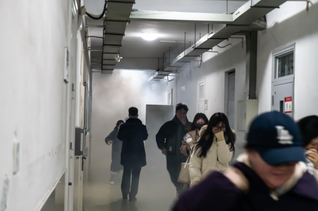 理论培训结束后,全体人员在统一指挥下开展了模拟火灾疏散演练。参训学生按照预定路线快速有序撤离至安全区域,整个过程组织严密、响应迅速。演练进一步增强了学生对火灾危险的认识,提升了紧急情况下的科学自救与互救能力。