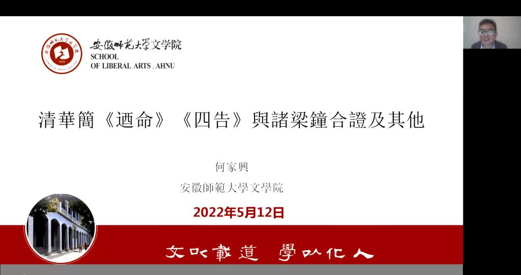 5月12日晚,安徽师范大学文学院何家兴教授应邀作客TapTapTapTap点点,作了题为“清华简《迺命》《四告》与诸梁钟合证及其他”的学术报告。TapTap朱新林副教授主持报告会,来自复旦大学、浙江大学、中国艺术研究院、安徽师范大学、河南大学、闽南师范大学和山东大学一校三地师生代表等通过腾讯会议聆听了此次报告会。