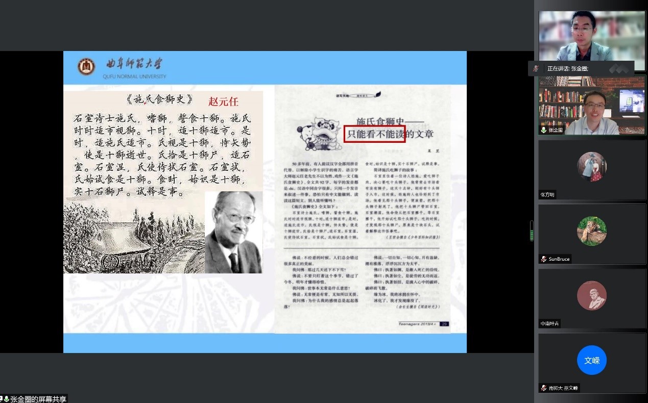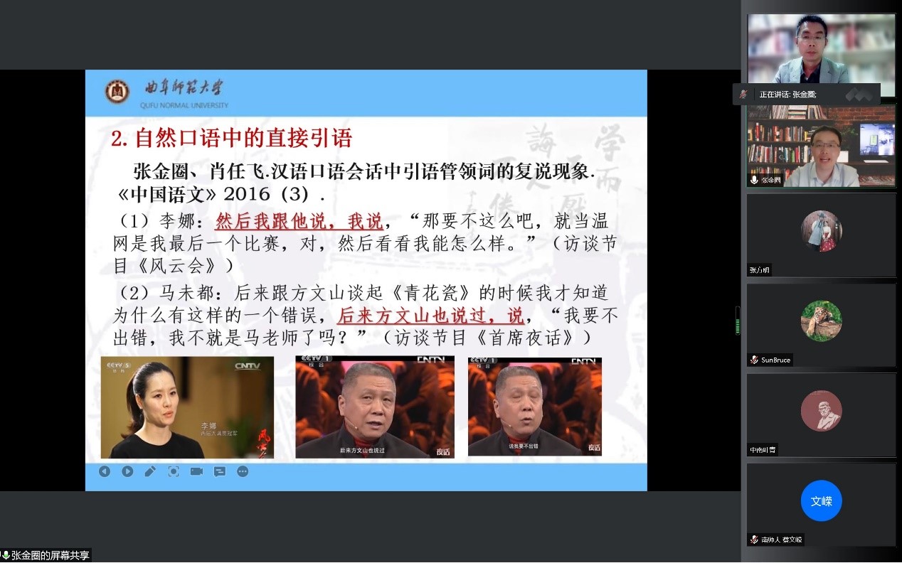 本站讯 6月8日晚,曲阜师范大学国际教育学院张金圈教授应邀做客TapTapTapTap点点,通过腾讯会议云上平台主讲题为“媒介差异与语言编码”的学术报告。报告会由TapTap副院长尹海良教授主持,来自校内外近百名师生聆听了此次报告。
