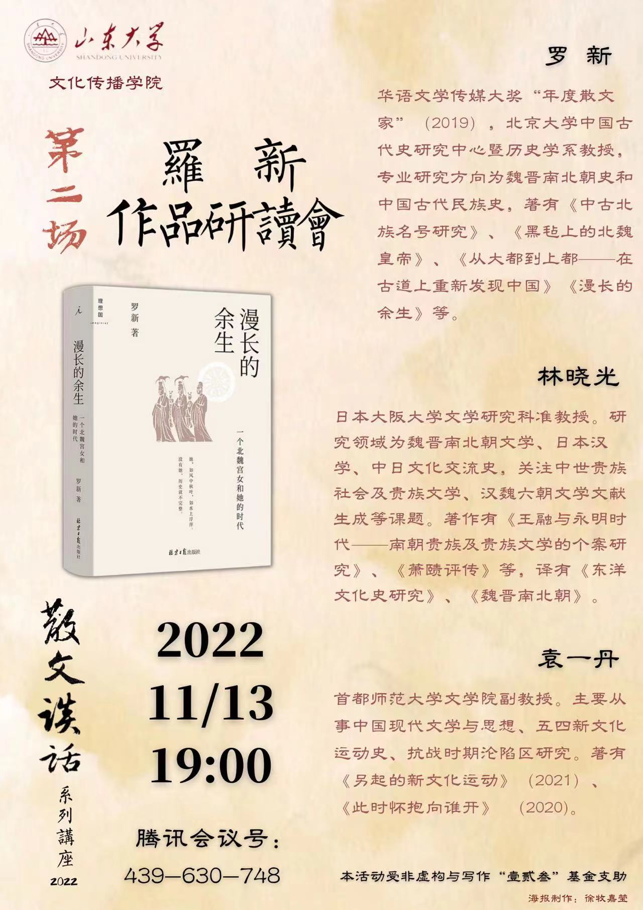 罗新是一位“出圈”的历史学家,虽为北大中国古代史研究中心暨历史学系教授,可从小就有一个作家梦,因此本科入读了北大中文系,虽此后进入历史学界成为优秀的史家,不过文学梦始终在心底挥之不去,除学术著作外,他也写了许多散文作品,拥有广泛的读者群,并获得2019年度华语文学传媒大奖“年度散文家”。研读会将组织学者与学生一起讨论罗新散文的创作风格,罗新本人将分享自己的写作经历,剖析个人创作之得与失,林晓光和袁一丹将分别从文体与现代散文的角度谈罗新的散文特色。
