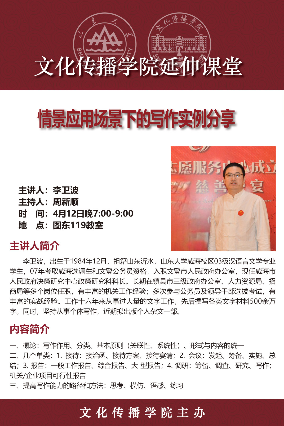 李卫波,出生于1984年12月,祖籍山东沂水,山东大学威海校区03级汉语言文学专业学生,07年考取威海选调生和文登公务员资格,入职文登市人民政府办公室,现任威海市人民政府决策研究中心政策研究科科长。长期在镇县市三级政府办公室、人力资源局、招商局等多个岗位任职,有丰富的机关工作经验;多次参与公务员及领导干部选拔考试,有丰富的实战经验。工作十六年来从事过大量的文字工作,先后撰写各类文字材料500余万字。同时,坚持从事个体写作,近期拟出版个人杂文一部。