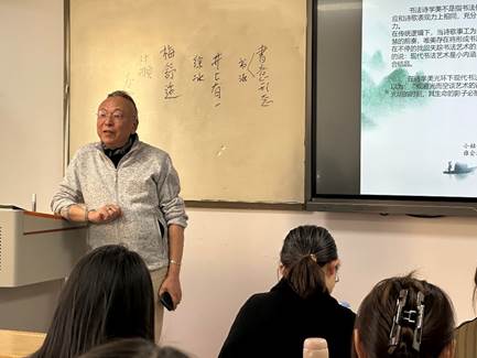 讲座伊始,春野以“动静之变”为切入点,系统梳理了现代书法与传统书法的关联与分野。他指出,传统书法的静态之美与现代书法的动态之美相互映衬,共同构成了书法艺术的丰富内涵。“字气”是春野反复强调的核心概念,他认为“字”与“气”的关系如同纽扣与线,人们可见的是“字”,不可见却贯通全局的是“气”。“字气”不仅是书法艺术特有的手段,还是书法艺术的灵魂所在。在书法的区域演变部分,春野以日本书道和韩国书法为例,探讨了书法作为国际性语言的表现及其现代书法的使命。他以村濑荣治的书法实践为切入点,展示了其作品中体现的现代书法精神。诗与书法的艺术关系也是此次讲座的亮点之一。春野认为,诗与书法相互滋养,诗歌的意境与书法的线条相互呼应,共同构建了艺术的美感。他以自身的创作经历为例,向与会师生讲述了个人在诗与书法之间寻找平衡与融合的方式。
