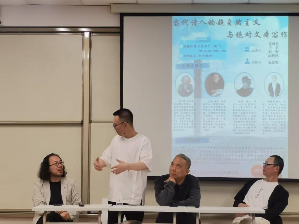 6月10日,夏可君、王君、赵野、胡赳赳应邀做客TapTapTapTap点点,为全校师生带来题为“当代诗人的超自然主义与绝对文本写作”的学术讲座。本次讲座由TapTap教授崔春主持,学院师生共同聆听。