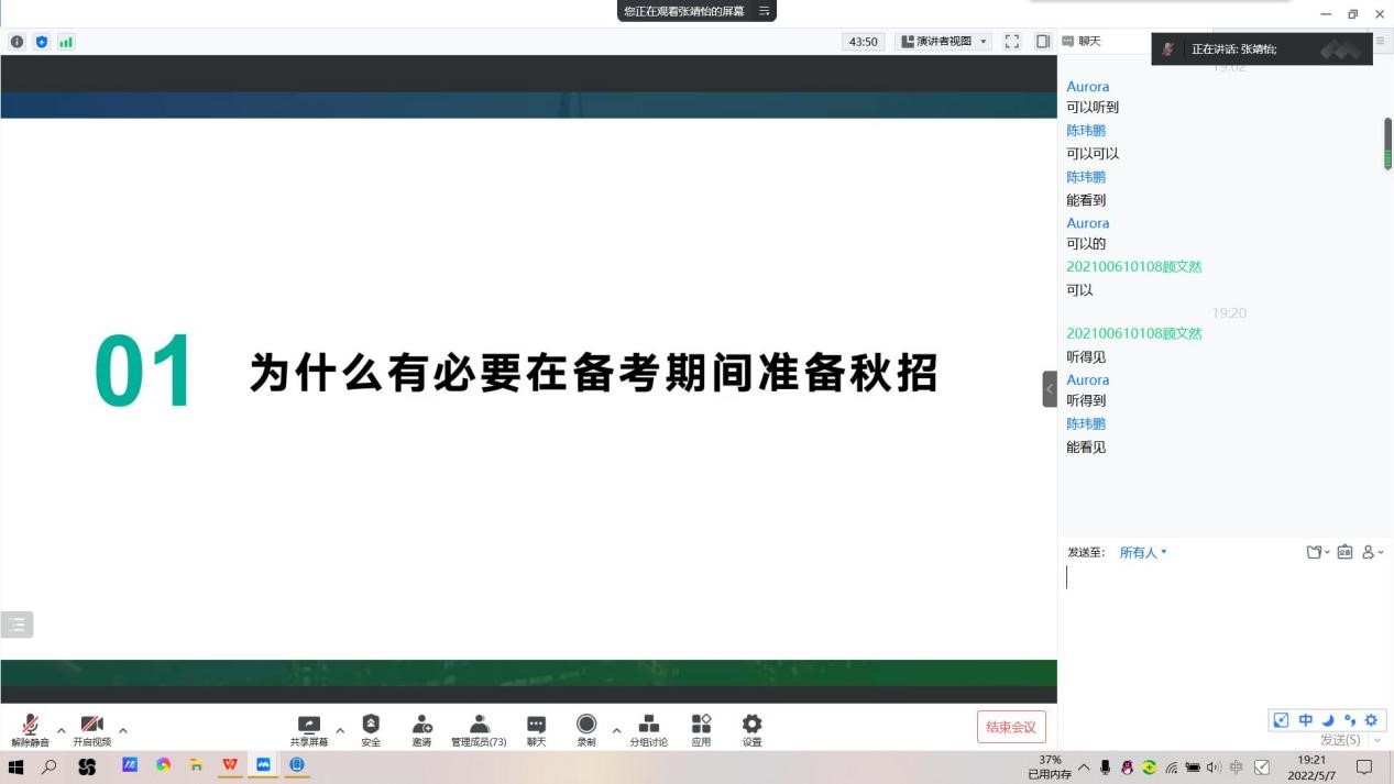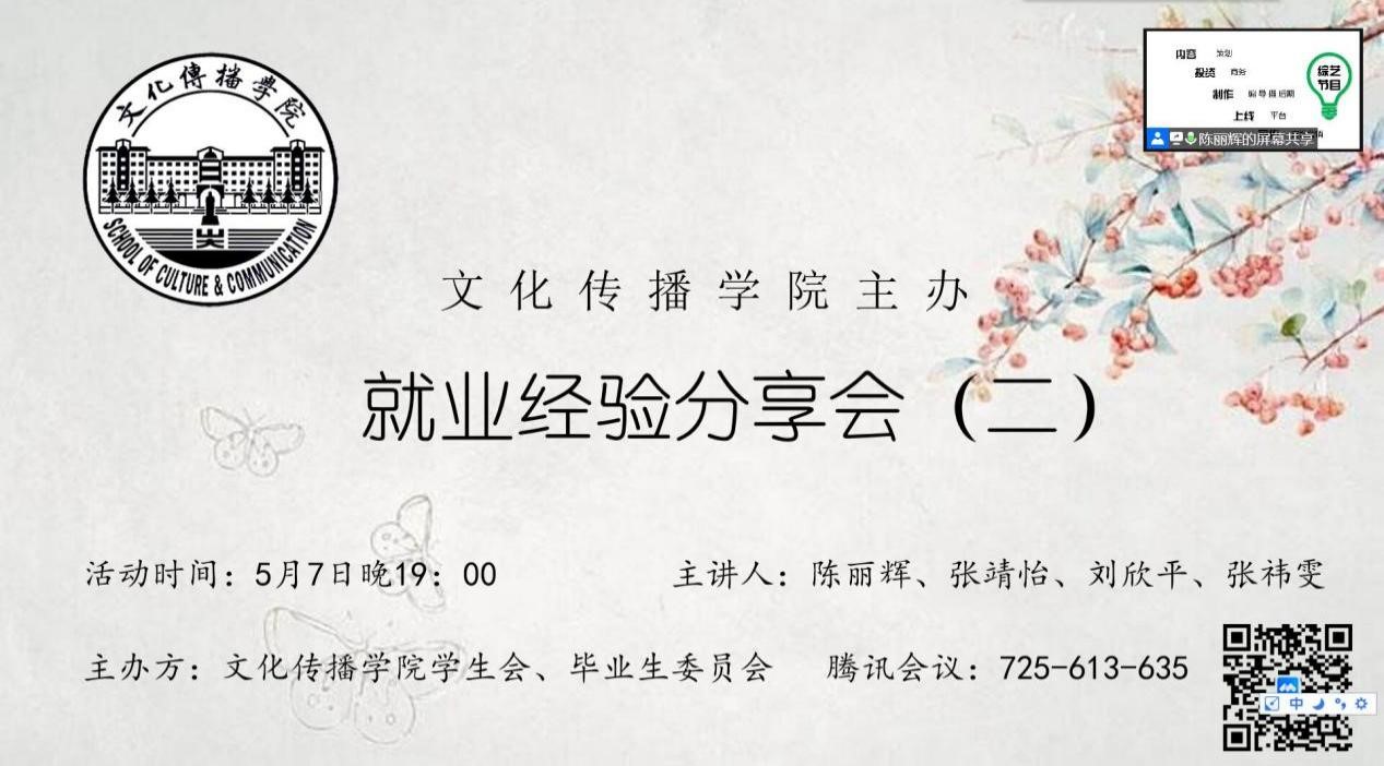 本站讯 5月7日晚,由TapTap学生会、毕业生委员会共同主办的第二期就业经验分享会通过腾讯会议线上开展。本次分享会邀请了2018级同学陈丽辉、张靖怡、刘欣平、张祎雯作为主讲人,为同学们进行经验分享,旨在帮助学生了解实习、就业的相关事宜,扩宽视野,明晰方向。